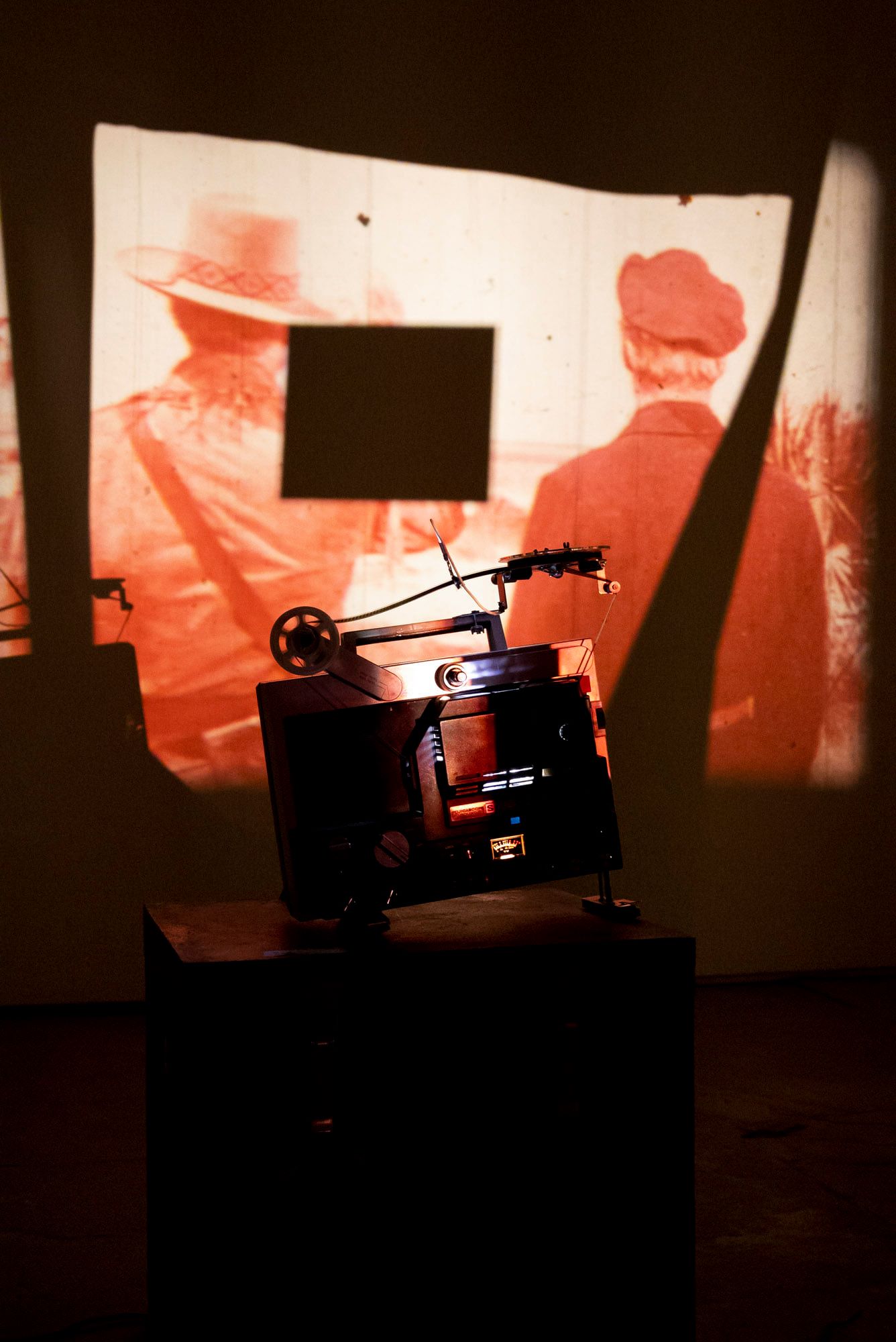 Red plastic, translucent plastic, white paint, 15x20cm mirror, fishing line, turning fan, 2 Super-8mm projectors, 2 Super-8mm loopers, 2 motion-detector plugs, 6 nautical clamp, 3 red fishnet bags